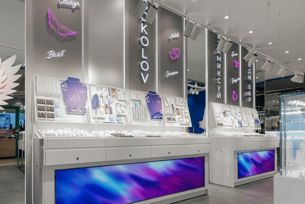 В торговом пространстве представлено свыше 2,5 тыс. наименований серебряных изделий в формате открытой выкладки. Концепция предусматривает свободный доступ к ассортименту и возможность самостоятельной примерки без привлечения консультанта, что оптимизирует клиентский путь и повышает конверсию в покупку.