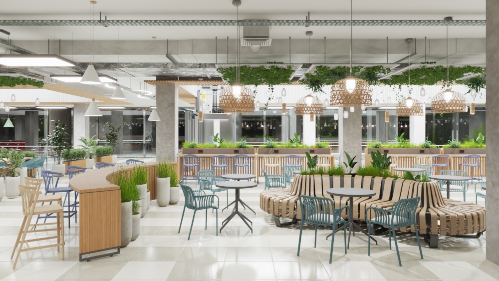 Концепцией проекта стал «Оазис в Мегаполисе»: здесь появятся три функциональные зоны: компактные столы для быстрого перекуса, групповые посадки для компаний в центральной части и лаунж-зоны с мягкой мебелью.