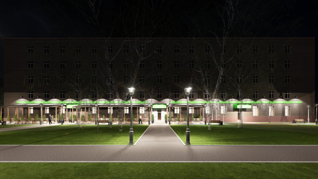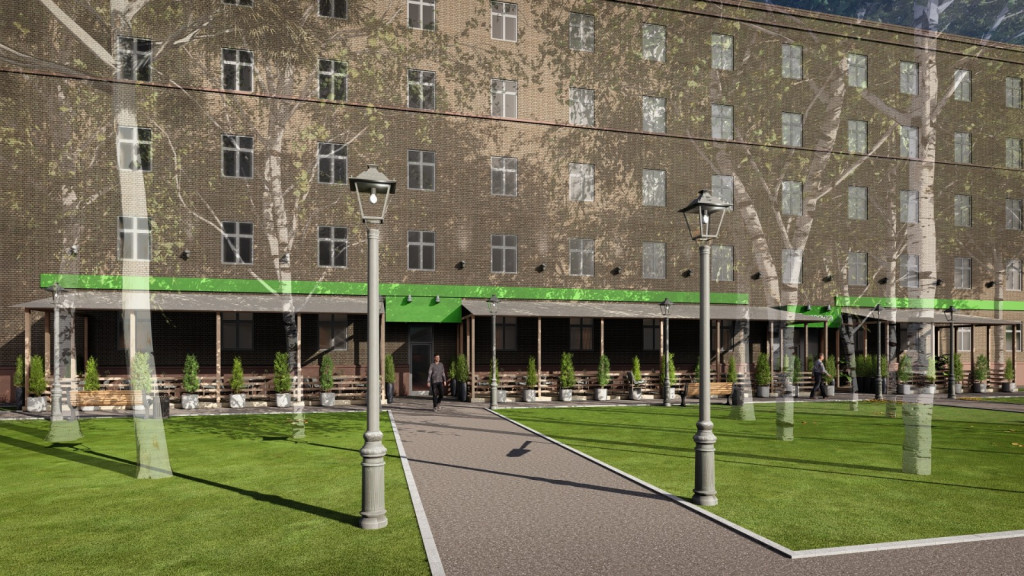 На фото представлен проект развития здания и прилегающей парковой зоны.