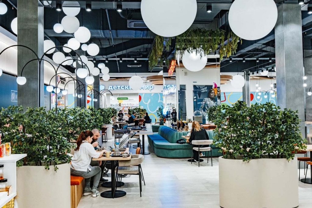 - Развитая инфраструктура — вместительная парковка с зарядными станциями для электромобилей, зоны отдыха и развлечений, фудкорт