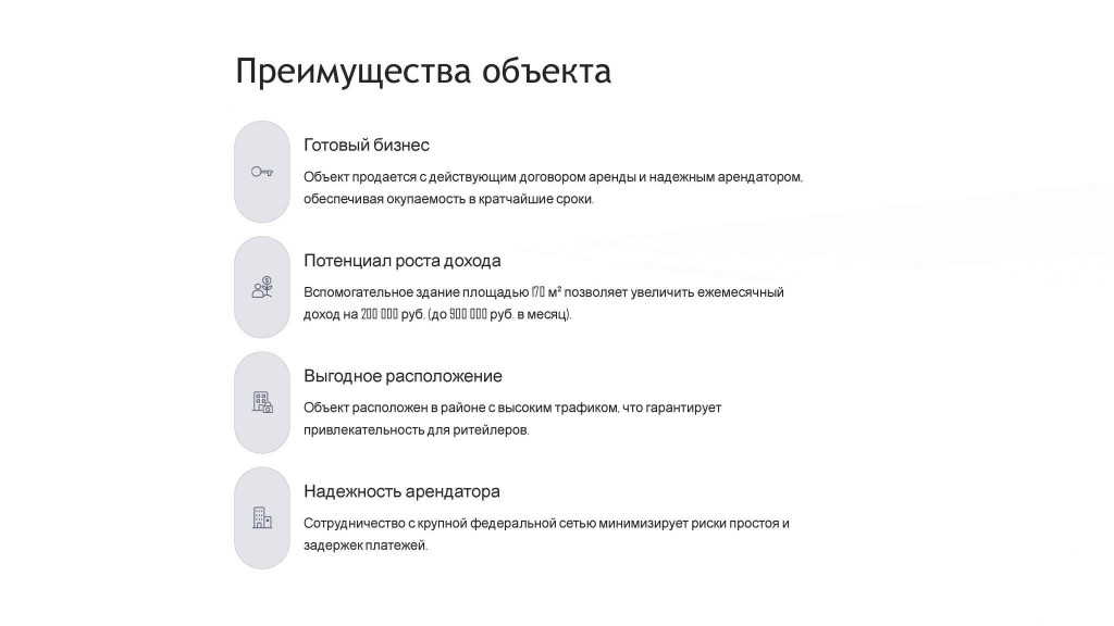 Идеальный актив для инвестора: не просто недвижимость, а работающий бизнес с моментальным денежным потоком от федерального арендатора. Покупая этот объект, вы приобретаете стабильность, защищенность и высокий потенциал роста.