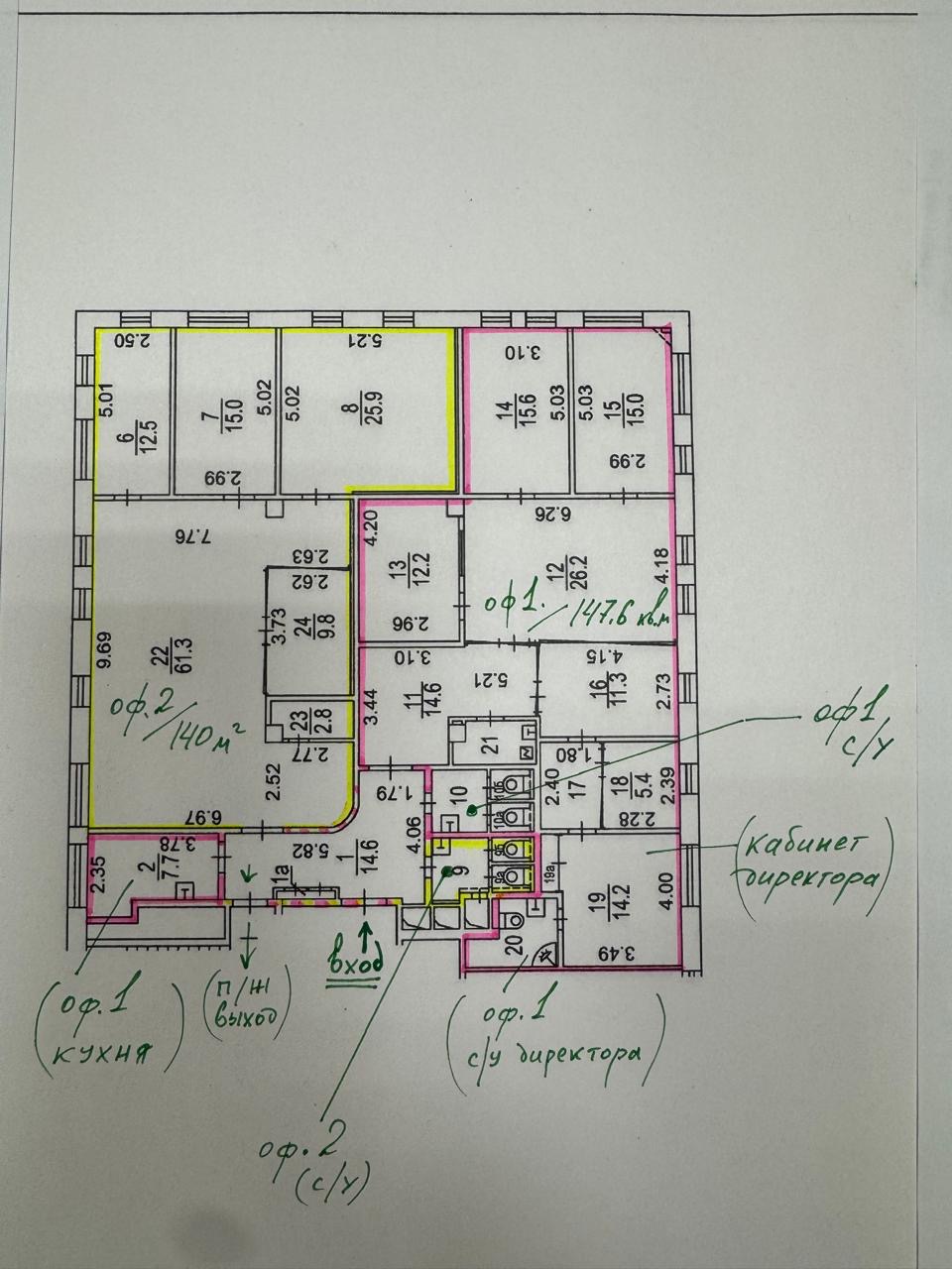 Планировка: помещение разделено на два офиса с площадями 140 м2 и 147,6м2)